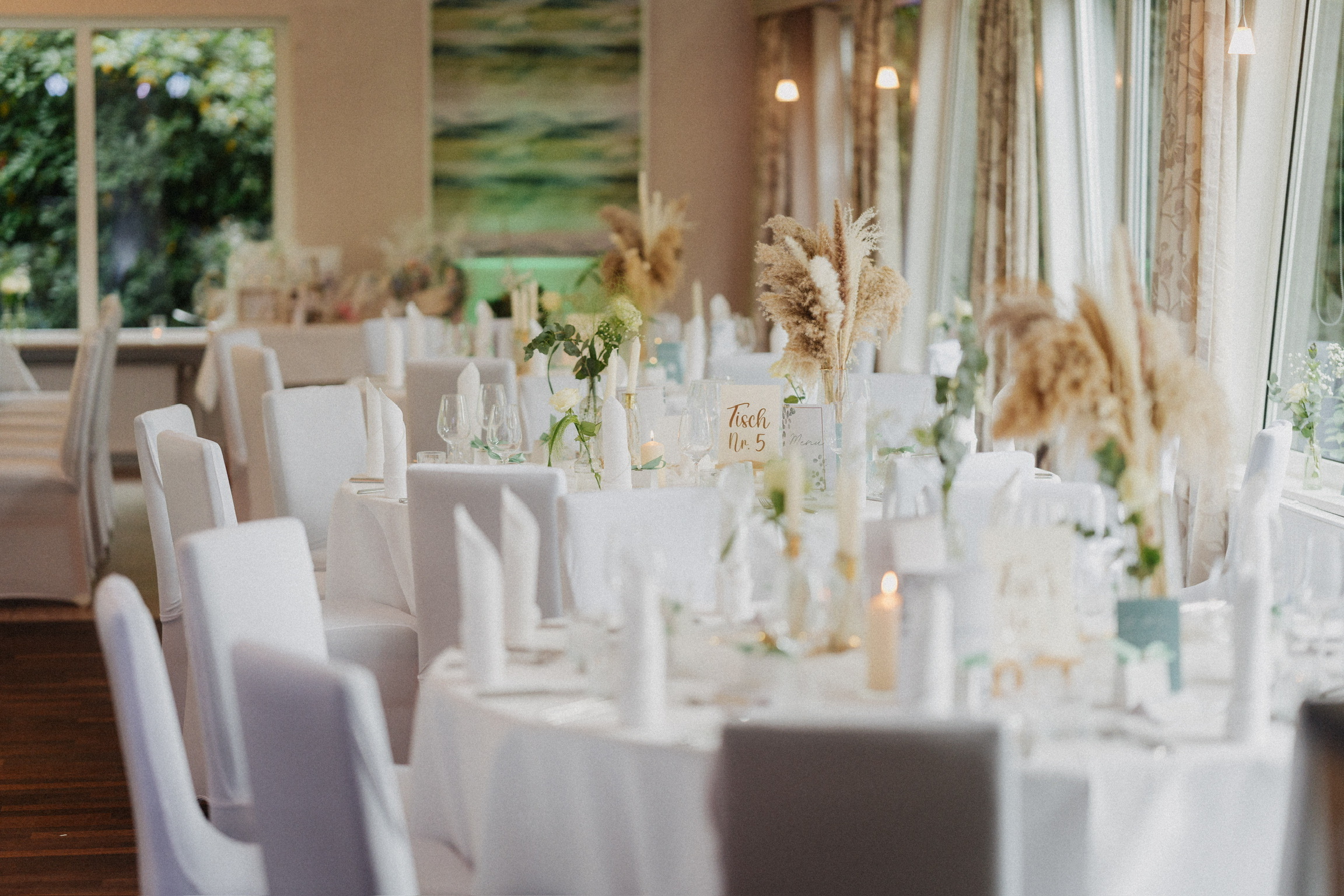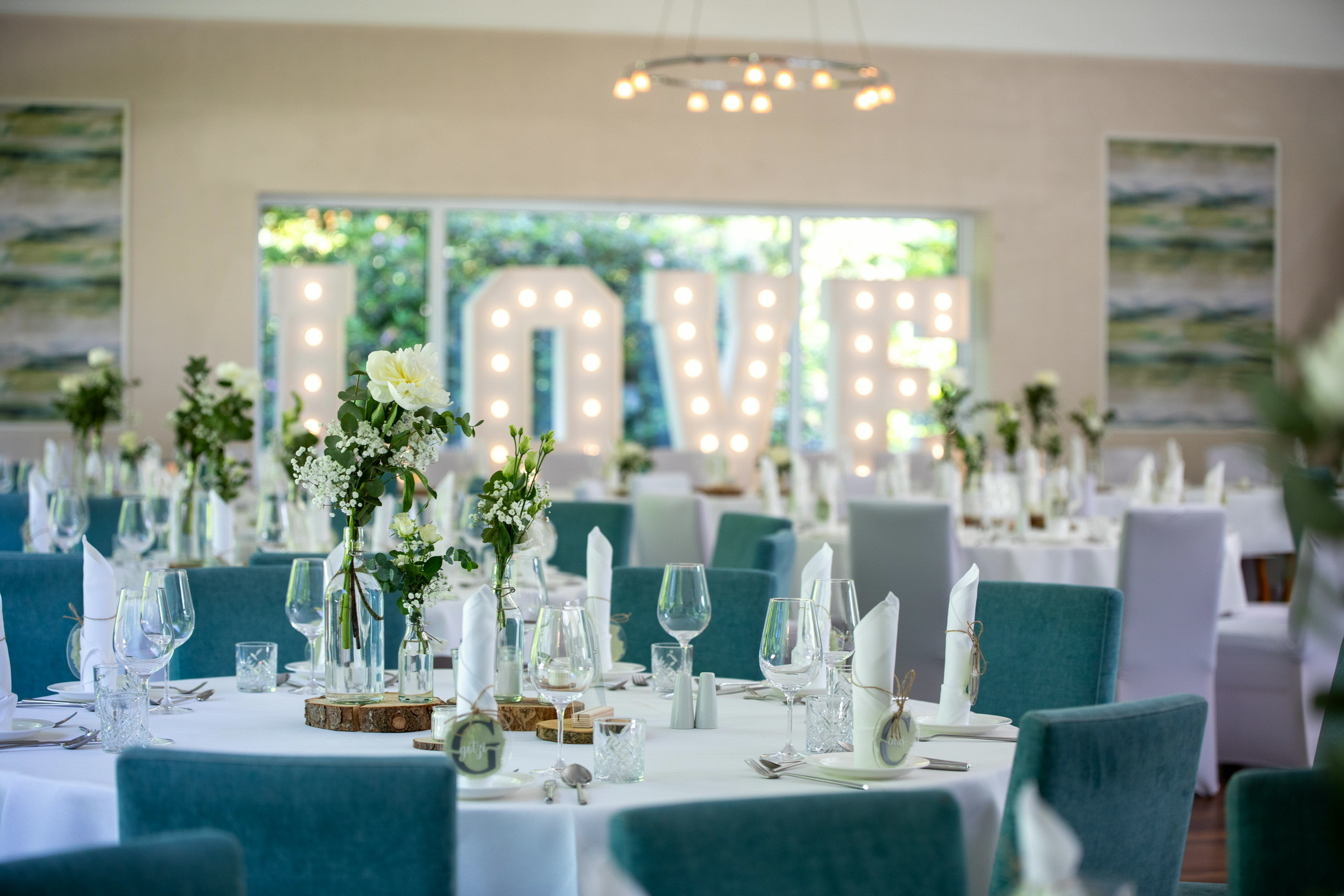 Ihre Gäste genießen im Licht durchfluteten Festsaal den wunderschönen Blick in den Park und auf unseren See. Ob genussvolles Menü oder fröhliche Party – alles ist möglich.